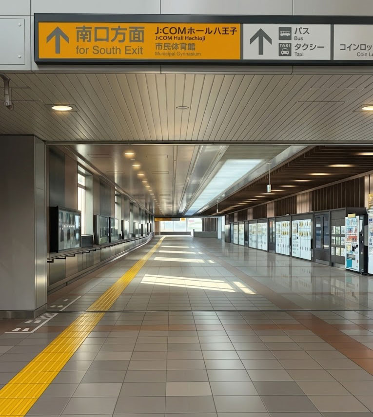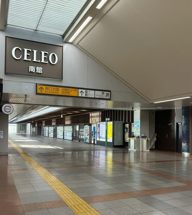 八王子駅の改札を出て左方向を向くと、CELEO南館および八王子駅南口方面の看板が見えます。