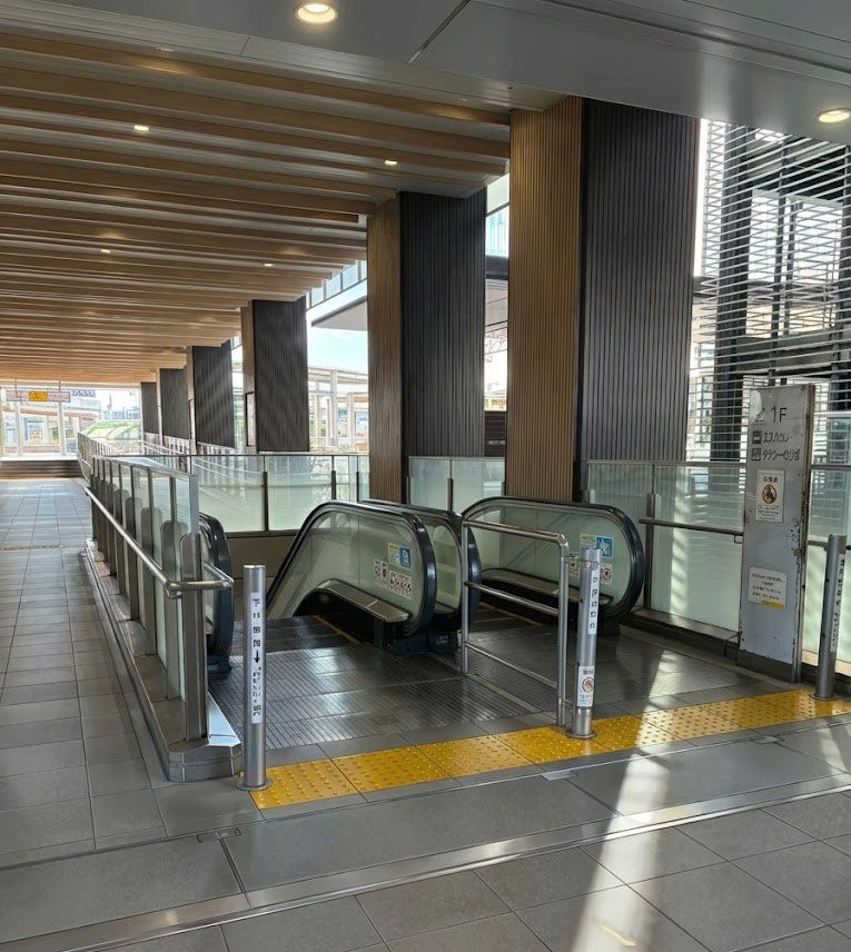まっすぐ進むと、右手にエスカレーターが見えます。エスカレーターを降りて1階に行きます。