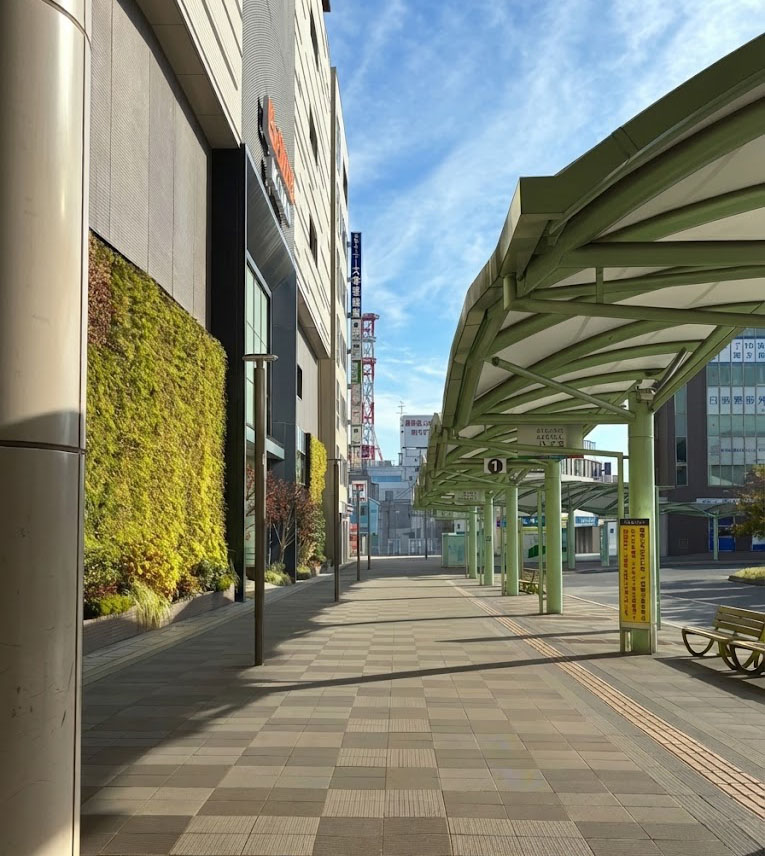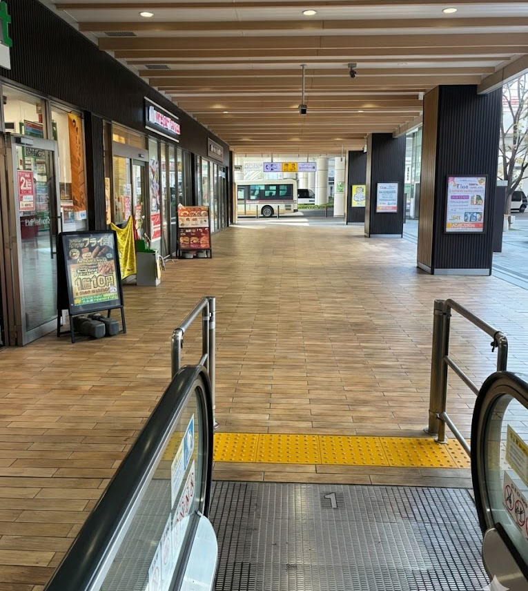 エスカレーターを降りると左手にファミリーマートさんとミスタードーナツさんが見えます。バスの見える方へ進みます。