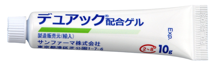 デュアック配合ゲル(一般名:クリンダマイシン+過酸化ベンゾイル) 1日1回、洗顔後にニキビとその周りに広げるように塗布。刺激がなければ目の周り・唇・鼻の入口などの粘膜および傷口をさけ、ニキビのできやすいところ全体に塗布。