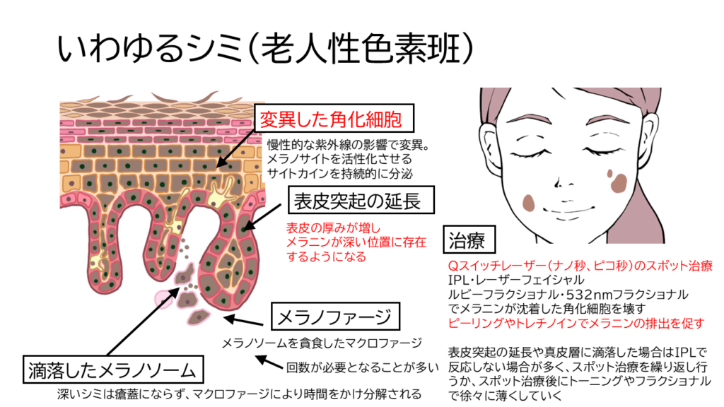 組織学的には表皮突起の延長といった過角化を認める場合や、慢性的な紫外線の影響やその他の外傷などにより、基底層の断裂を生じ、メラノサイトから生成されたメラニン色素が真皮浅層に滴落しマクロファージに貪食され、メラノーシスを生じている場合があります。真皮層へのメラノーシスでは、レーザーなどでの治療後にかさぶたにならずに残り、消えるのに数か月の期間が必要となる場合や、期間を開けて複数回の治療が必要となる場合があります。